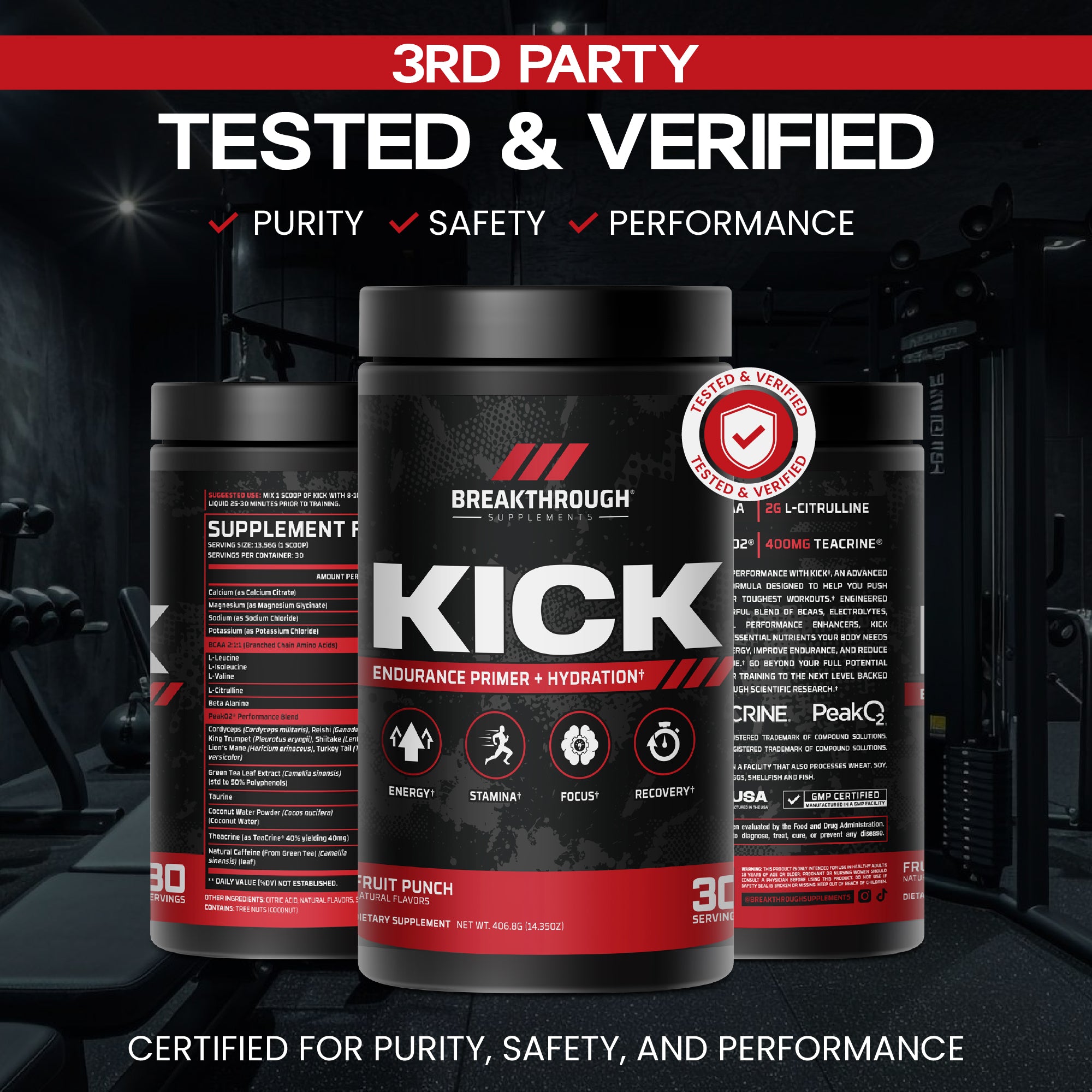 What you see is what you get. Kick features a fully disclosed label—zero proprietary blends, zero fillers, and zero fluff. Every ingredient is research-backed to boost endurance, focus, hydration, and recovery for athletes who take performance seriously. -